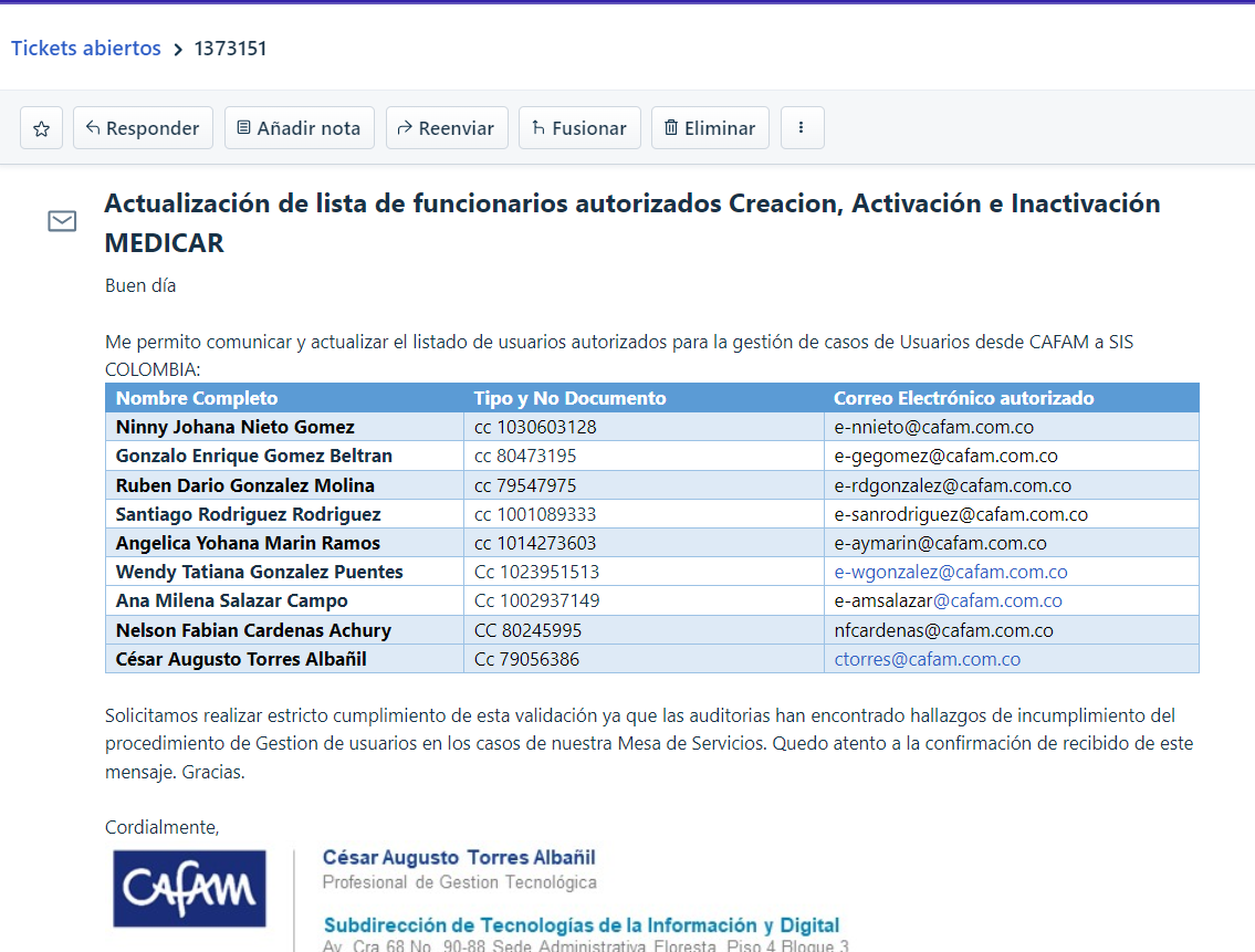 Me permito comunicar y actualizar el listado de usuarios autorizados para la gestión de casos de Usuarios desde CAFAM a SIS COLOMBIA: Ultima acualización 19 de diciembre de 2023 a tráves del ticket No 1584524.