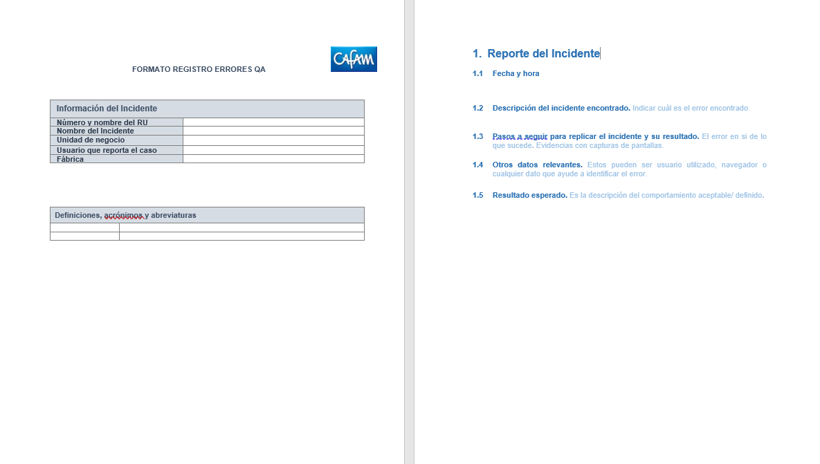 El formato de incidentes es un dcumento obligatorio, sin el no se debe escalar la solicitud al área de QA.