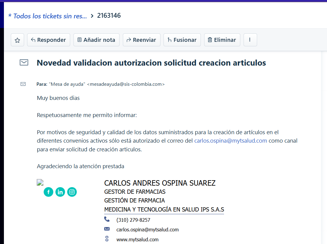 Por motivos de seguridad y calidad de los datos suministrados para la creación de artículos en el diferentes convenios activos sólo está autorizado el correo del carlos.ospina@mytsalud.com como canal para enviar solicitud de creación articulos.